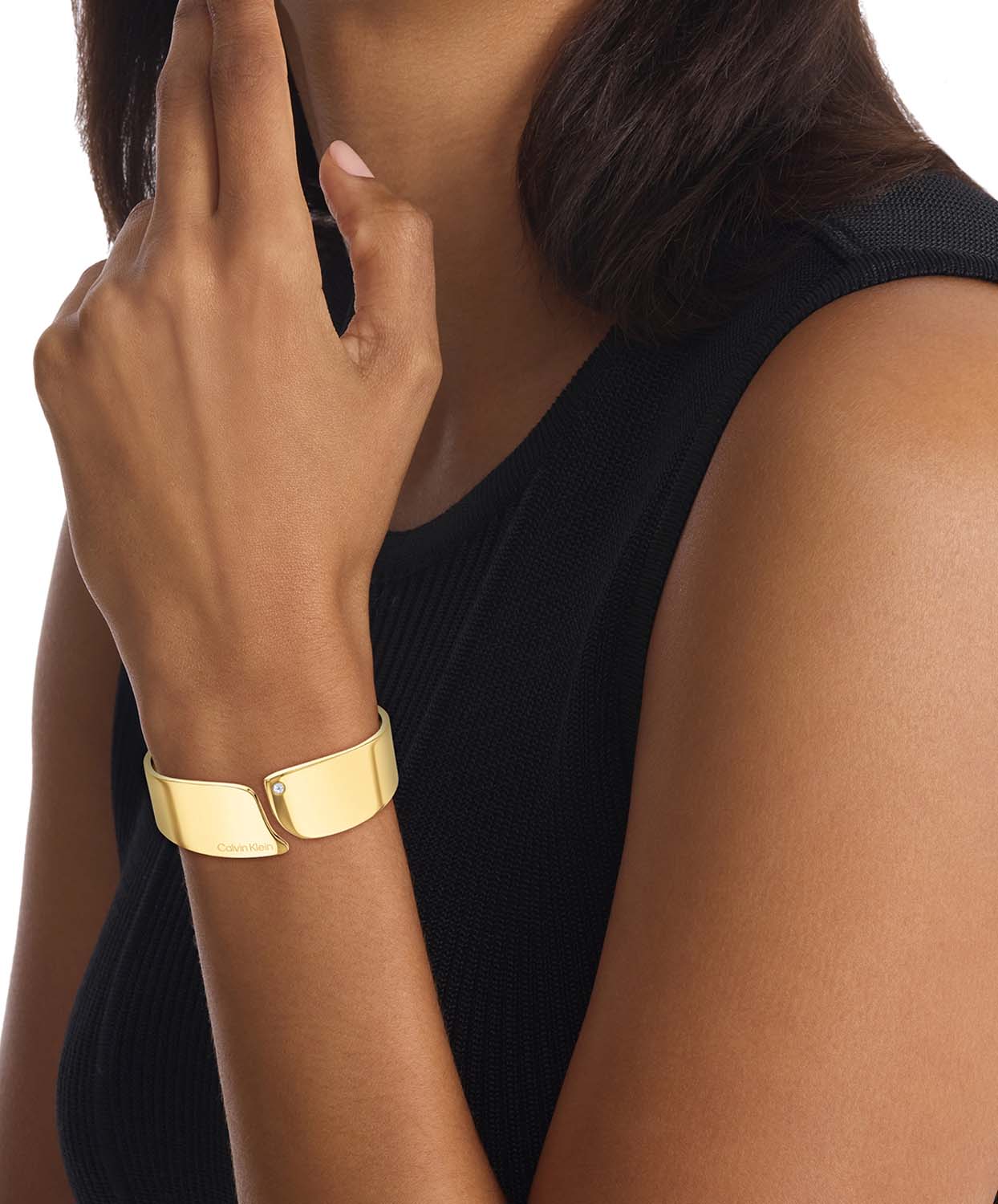 Deze stalen dames bangle van Calvin Klein met nr CJ35000657 heeft een sierlijk uiterlijk. De goudkleurige stijve armband is open aan de bovenkant, heeft ronde vormen, is glimmend en heeft een kristal aan 1 kant en is geschikt voor een pols van 17,5cm, door de opening is de maat iets aan te passen. Leuk te combineren met andere sieraden uit de serie van Calvin Klein.