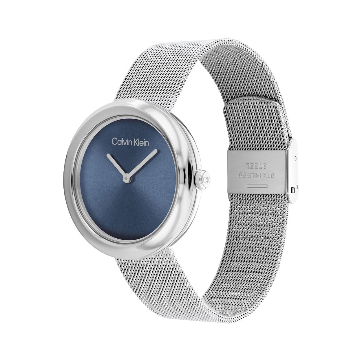 Dit Calvin Klein dameshorloge met nr CK25200014 heeft een strak en minimalistisch ontwerp. De stijlvolle ronde gladde stalen kast heeft een blauwe wijzerplaat waarop fijne wijzers en het logo zichtbaar zijn. Direct aan de zilverkleurige kast zit een zilverkleurige fijne milanese band. Het stijlvolle horloge heeft een mineraalglas, een doorsnee van 34mm en is 3 ATM.