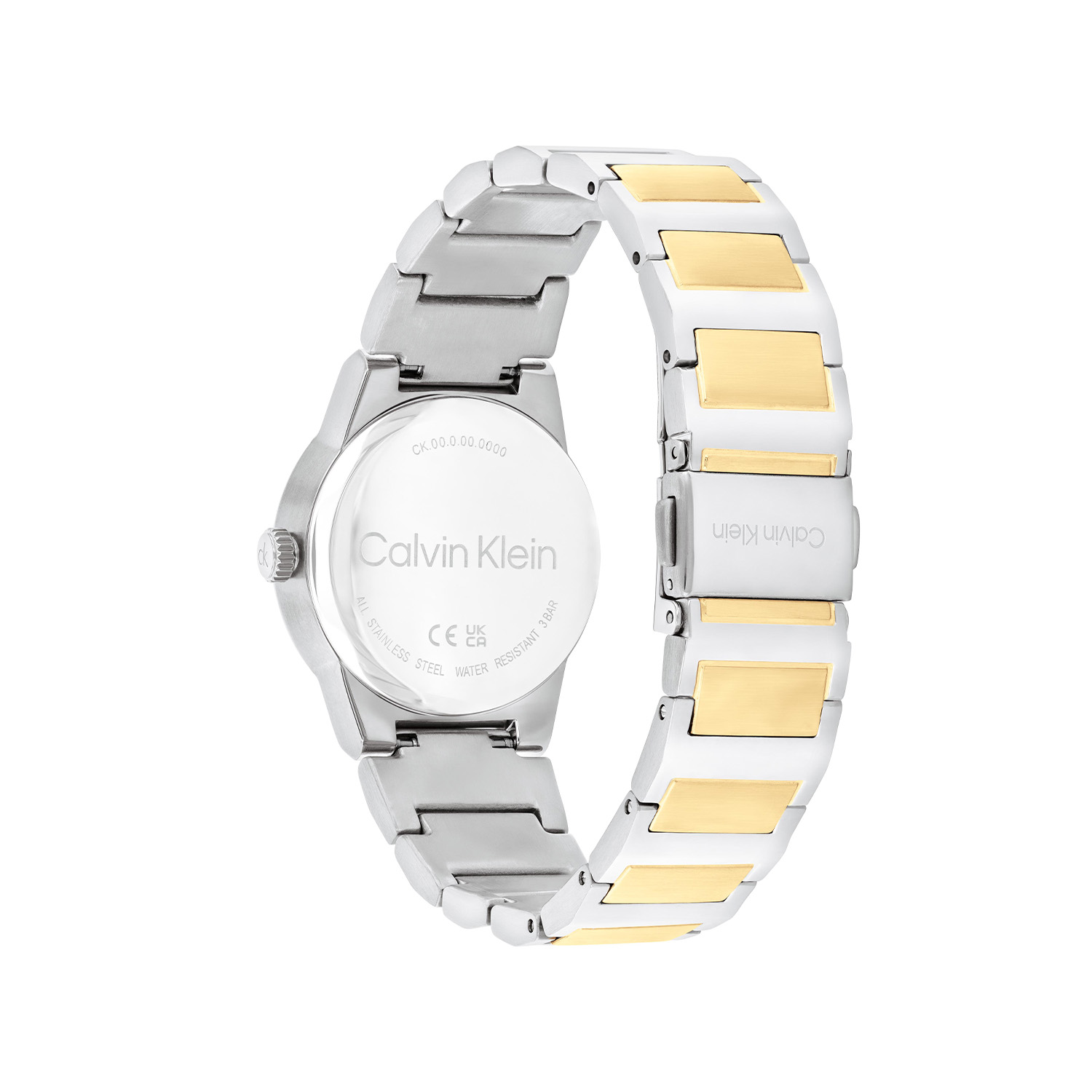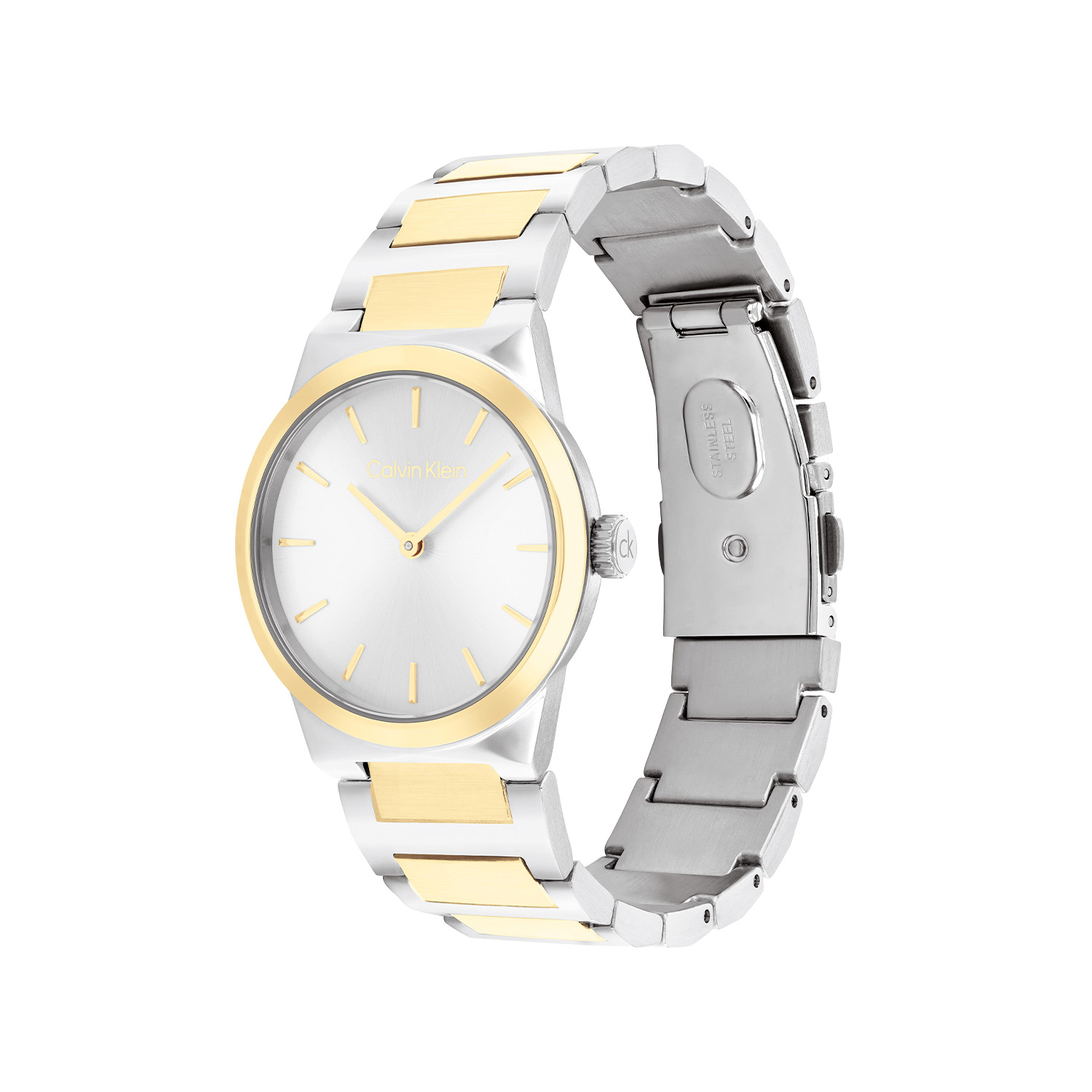 Dit Calvin Klein dameshorloge met nr CK25100113 heeft een elegant ontwerp. De ronde stalen kast heeft een goudkleurige glanzende bezel en een zilverwitte sunray wijzerplaat met fijne wijzers en fijne uursaanduiding. Strak aan het kastje zit een bicolor schakelband met een vouwsluiting. Het elegante dameshorloge heeft een mineraalglas, een afmeting van 32mm en is 3ATM.