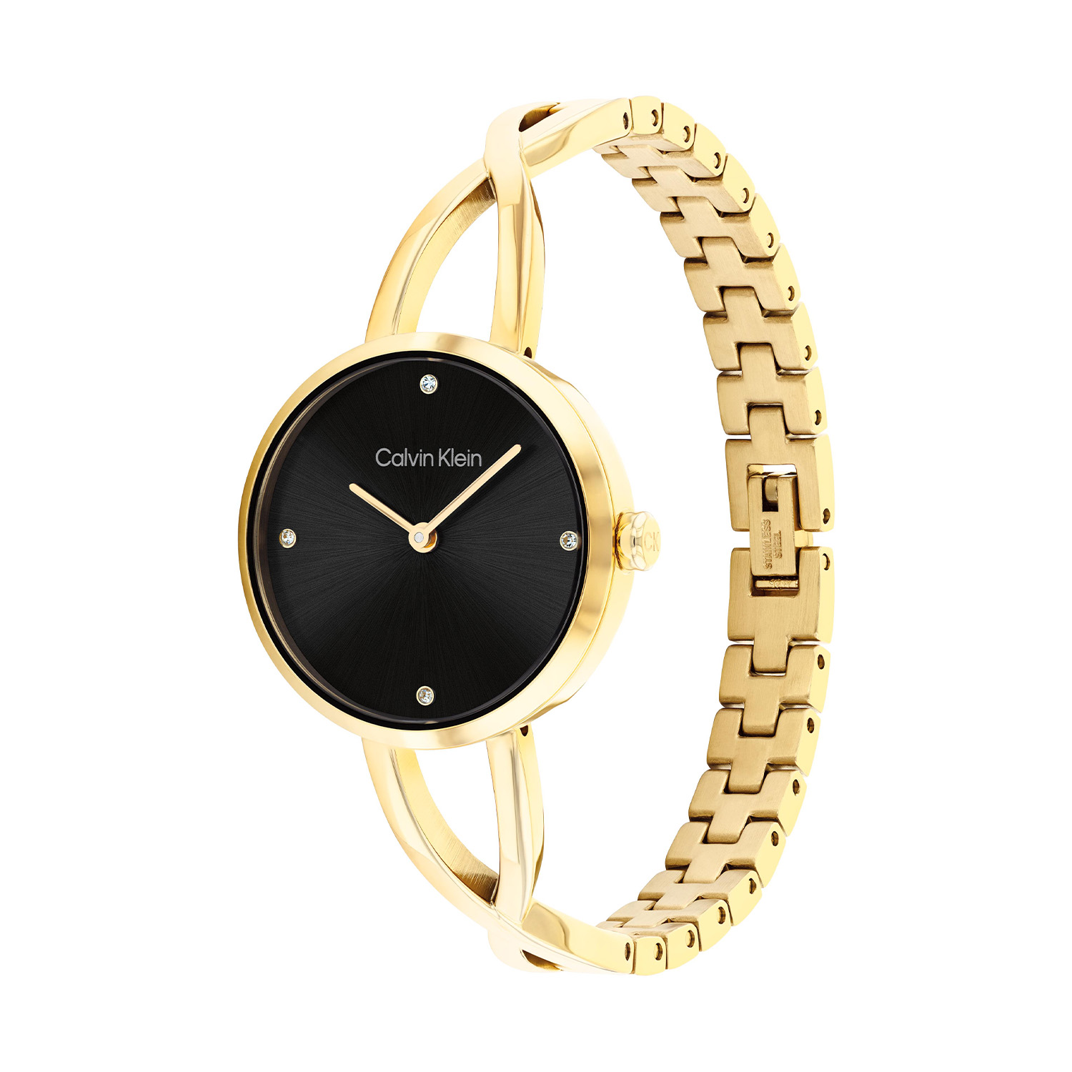 Dit Calvin Klein dameshorloge met nr CK25100059 is een klassiek ontwerp. De stijlvolle ronde stalen goudkleurige kast heeft een gladde goudkleurige bezel, een zwarte sunray wijzerplaat met fijne wijzers en op de 3,6,9 en 12 een kristal als uursaanduiding. Strak aan de kast zit een stalen fijne goudkleurige bangle band die uitloopt in schakels en daar te verstellen is op maat. Het elegante dameshorloge heeft een mineraalglas, een doorsnee van 28mm en is 3ATM.