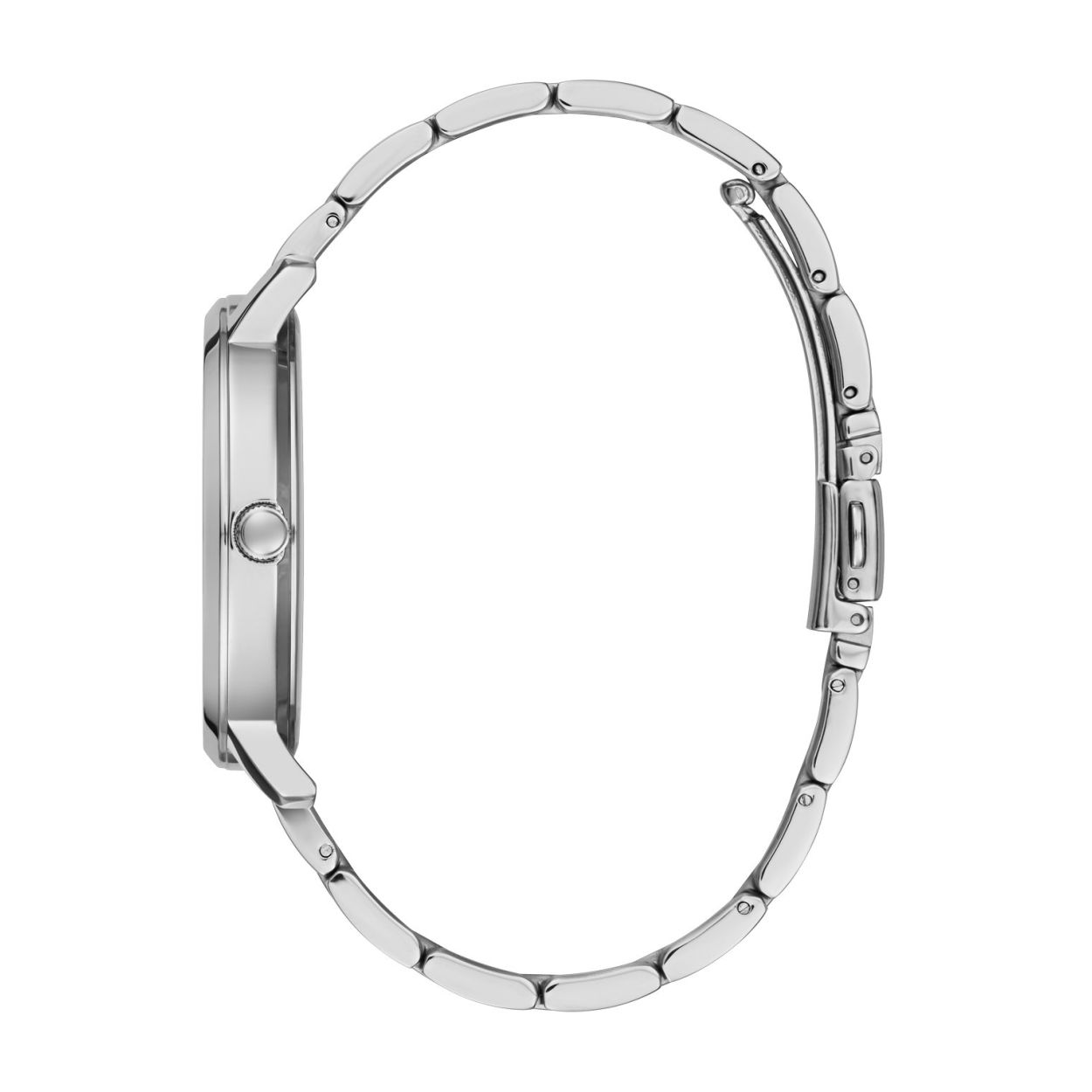 Eenvoud is de kracht van dit prachtige GUESS dames horloge uit de Nova serie. De zilverkleurige kast heeft een diameter van 40 mm en een strakke minimalistische zilverkleurige wijzerplaat die voorzien is van diamanten single cut 8/8 0.005 ct. op 12 en 6 uur. De schakelband sluit middels een vouwsluiting en dit horloge is tot 3 ATM waterdicht. Model: W1313L1.